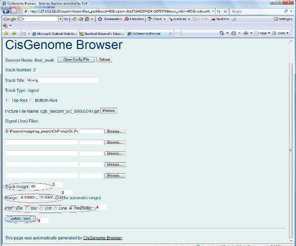 In the configuration page, you can change the height of the track (red circle 3 below), you can change the plot type (red circle 4), and you can also set the range of the display (red circle 5). By default, the range is set as “0.0 - 0.0”, this means that the browser will automatically determine the range of the data, and choose the minimum and maximum labeling of the Y-axis accordingly. When you change it, say, if you set the range to be “-5.0 - 5.0”, the minimum and maximum of the Y-labeling of the track will be fixed to –5 and +5 respectively. In this way, you can display data in different tracks on the same scale. After you modified your parameter settings, you can click the “Update Track” button (red circle 6). A new plot will show up. Look to see what happens.